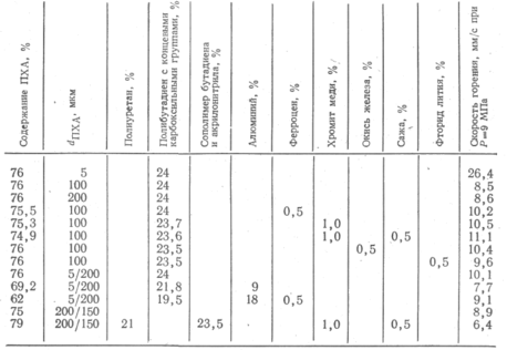 Анализ комплексного влияния различных компонентов топлива на скорость горения проделан авторами работы [92]. Они исследовали в бомбе постоянного давления скорости горения смесевого топлива в зависимости от размера частиц окислителя (ПХА), природы связующего вещества, содержания алюминия, а также присутствия катализаторов и ингибитора. Установлено, что для топлива на основе полибутадиена с концевыми карбоксильными группами в отсутствие алюминия при использовании мелкодисперсного ПХА скорость горения без катализатора достигает 26 мм/с. Крупнодисперсный ПХА