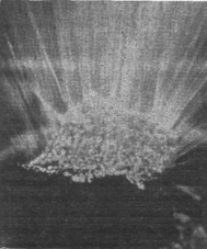 Экспериментальные данные, полученные с помощью деривато-графического анализа, указывают на влияние каталитических добавок (Fe, Fe2O3, ферроцен) на процессы взаимодействия продуктов разложения компонентов при температуре ниже температуры поверхности при горении. Определенный интерес представляют наблюдения за изменением структуры горящей поверхности при введении в состав смеси катализаторов горения. На всех смесях с добавкой катализатора отмечается появление на поверхности горения отдельных ярко светящихся очагов размером 100—200 мкм (рис. V.29). Поскольку число очагов значительно меньше среднего вероятного числа частиц катализатора на поверхности горения, возникает предположение о возможной агломерации частиц катализатора на поверхности горения.