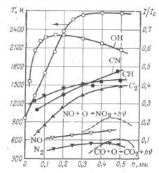 епосредственно вблизи поверхности горения образца наблюдается излучение радикала •ОН, превосходящее излучение С2, •CN, •СН. С ростом температуры по высоте пламени увеличивается интенсивность излучения СН, C2, CN. Для эмиссионного спектра продуктов сгорания смесевого топлива характерно существование двух непрерывных континуумов излучения при 350— 450 и 400—600 нм, природа излучения которых связана, с наличием в пламени свободного атмосферного кислорода [52].