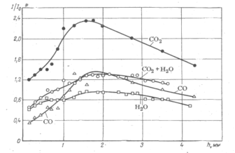 Рис. V.28. Распределение относительной интенсивности спектральных линий продуктов сгорания по высоте пламени смеси ПХА + ПММА (αст = 1) в ИК-области спектра (Р=0,2 МПа; и—1,2 мм/с; Tмакс=2050 К; масштаб ординаты кривой CO2