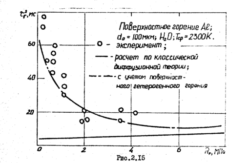 Возросший поток паров металла окончательно разрушает жидкую окисную пленку, что часто приводит к нарушению устойчивости самой капли, ее дроблению. Фронт пламени отходит от поверхности частиц, что соответствует качественному изменению режима горения: переходу поверхностного горения в газофазное. Таким образом, развитию эффективного газофазного режима горения всегда предшествует малоэффективный поверхностный, длительность которого в значительной степени зависит от размера частиц Al, давления и тeмператуpы среды. Следовательно, снижение продолжительности поверхностного режима горения с ростом давления также приводит к уменьшению общего времени горения.