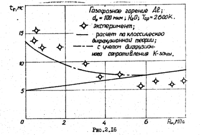 Результаты расчета г частиц Al в среде паров воды при поверхностном и газофазном режимах горения приведены на рис. 2.15 и 2.16. Как видим, г на газофазном режиме горения значительно (в 4...6 раз) меньше г тех же частиц на поверхностном режиме. Результаты расчета по представленной выше методике удовлетворительно согласуются с экспериментом и существенно отличаются от результатов расчета по классической диффузионной теории в области давлений до 5 МПа. Объясняется это, как указывалось выше, наличием дополнительного диффузионного сопротивления К-зоны, которое не учитывается в классической теории. При достижении 5...6 МПа длина свободного пробега газовых молекул становится меньше расстояния между cyбмикpoнными частицами К-фазы (l < Z), т.е. диффузионное сопротивление К-зоны становится пренебрежимо малым. Иными словами, при Рср > 5...6 МПа результаты расчетов по классической диффузионной теории и представленной методике должны иметь полное согласование (правая часть привой, рис. 2.16).