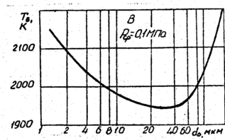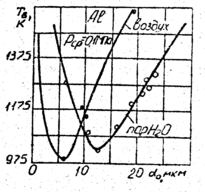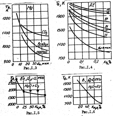 Эксперименты показали, что состав среды оказывает влияние не только на tu, но и на Тв. Представляет большой интерес вопрос о влиянии на Тв в составе окислительной среды СО2, Н2О, СО, Н2, Сl2 и др. На рис.1.3 приведена зависимость Тв = f(d0) для частиц Mg в различных средах: СО2, пары Н2О, воздух [41]. Из рисунка. видно, что водяной пар благоприятствует воспламенению частиц Mg, по сравнению с СО2 и воздухом. По данным [92] температура воспламенения частиц Al c d0 = 1...20 мкм в парах воды выше температуры воспламенения в воздухе, что противоречит данным [27], где показаyо противоположное соотношение для частиц d0 > 10 мкм. В работе [107] вообще не обнаружено влияние воды на процесс воспламенения Al.