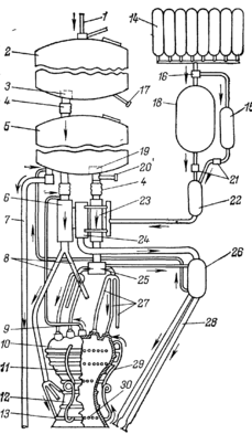 1 — труба для наддува бака за счет скоростного напора; 2 — бак. с горючим (спиртом); 3—клапан расхода горючего; 4 — сильфон; 5 — бак с окислителем (жидким кислородом); 6 — насос подачи горючего, 7 — дренажный трубопровод окислителя; 8, 29 — трубопроводы подачи горючего; 9 — перепускной трубопровод (для снижения тяги), 10 — головка двигателя; 11 — камера сгорания, 12 — сопло двигателя, 13 — вход горючего в рубашку охлаждения, 14 — баллоны с сжатым азотом; 15—бак с раствором перманганата калия, 16 — редуктор; 17, 20—заправочные патрубки; 18— бак с Н2 О2; 19—клапан расхода окислителя; 21 — расходные клапаны, 22—парогазогенератор, 23— насос подачи окислителя; 24—турбина; 25 — распределитель; 26 — теплообменник; 27 — трубопроводы подачи окислителя; 28 — выход отработанного пара; 30—отверстия поясов внутреннего охлаждения.