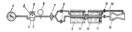 1—баллон с сжатым азотом, 2—поршень, приводимый в движение при сгорании порохового заряда; 3—пороховой заряд; 4—пусковой клапан; 5—разрывная диафрагма пускового клапана; 6—регулятор давления; 7 — предохранительный клапан; 8,1З—разрывные диафрагмы в трубопроводах; 9, 10 — баки с горючим и окислителем, 11 — гибкий трубопровод; 12'— газопровод; 14— калиброванные жиклеры; 15—камера сгорания.