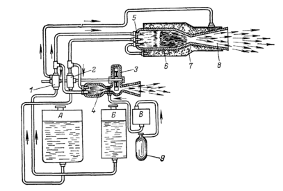 Рис 1.3. Схема ЖРД с газобаллонной системой подачи топлива зенитного снаряда «Вассерфаль»: