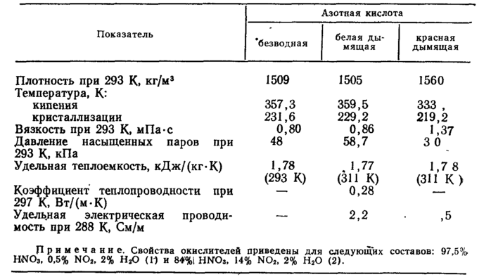 Таблица 3.5. Физические свойства окислителей на основе азотной кислоты