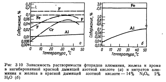 В ракетной технике США используют также окислитель «НДА», состоящий из смеси N204 (44%) и HNO3 (56%), в которую добавляют от 0,7 до 1,0% HF [32]. Большее или меньшее содержание фторида водорода усиливает коррозию [4, 32]. Ингибитор HF относится к летучим соединениям, способным защищать металл в жидкой и паровой фазах окислителя. Ингибирующее действие HF объясняется созданием на поверхности металла_малорастворимой защитной пленки фторидов металлов, растворимость которых в окислителе значительно ниже растворимости соответствующих нитратов (рис. 3 10). Когда фторид водорода добавляют в систему НМОз—N304, происходят реакции