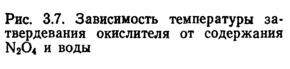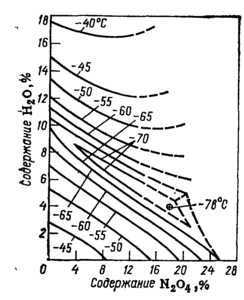 С увеличением содержания оксидов азота в окислителе повышается давление его насыщенных паров и снижается температура кипения. Так, при содержании 40% N204 и 1% Н2О температура кипения такого окислителя составляет 45°С. Считается, что азотная кислота, содержащая 20—30% оксидов азота, стабильна при хранении и не выделяет кислорода, который
