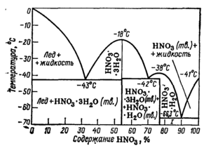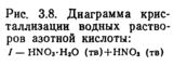 С водой азотная кислота смешивается в любых соотношениях, при этом выделяется большое количество тепла. На рис. 3.8 представлена диаграмма кристаллизации системы HNO3— Н20. Как видно из диаграммы, в растворе образуются тригидрат НNОз-ЗН2О (53,8% НNОз) с температурой кристаллизации —18°С и гидрат НNОз-Н2О (77,8% НNОз), температура кристаллизации которого —38 °С. Трем эвтектическим точкам (—66, —42 и —43 °С) соответствуют концентрации HNO3 89, 95, 77,5 и 32,7%.