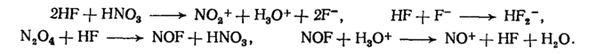 Проведенными исследованиями [32] было установлено, что в системе НNОз—N2O4—H2O присутствуют следующие ионы и молекулы: NO+, N0z+, NOs-, H2O, НNОз, N02, N204, НNОз-Н2О. Ионы NO+ и NOз- образуются при диссоциации молекул N204 в красной дымящей азотной кислоте.