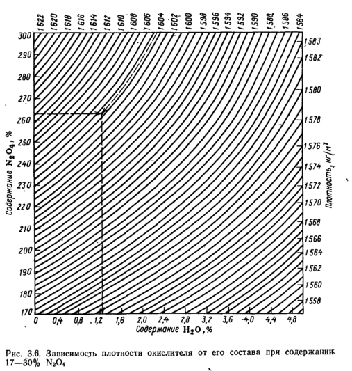 повышает давление в герметически закрытых баках при разложении азотной кислоты. Для отдельных космических объектов целесообразно применять азотнокислотный окислитель, содержащий 44% N204 и имеющий максимальную плотность 1650кг/м3 при 20°С[4].