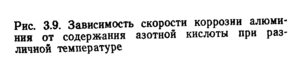 Ряд металлов и сплавов относительно стоек к воздействию* окислителей на основе азотной кислоты. К ним относятся, например, алюминий и его сплавы, хромоникелевые легированные стали. Слабое взаимодействие этих металлов и сплавов объясняется образованием на их поверхности под действием концентрированной азотной кислоты труднорастворимой оксидной пленки,- которая защищает металлы. Скорость коррозии металлов увеличивается с повышением температуры и содержания воды в окислителе. Так, по отношению к алюминию наибольшей активностью обладает окислитель, в котором содержится 70% H20 (рис. 3.9). Скорость коррозии алюминия: