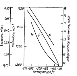 Рис. 3.15. Зависимость плотности р, динамической вязкости т) и поверхностного натяжения о жидкого фтора от температуры