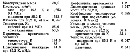 Высокие энергетические свойства жидкого фтора как ракетного окислителя известны давно, однако он так же, как и монооксид фтора, не получил широкого распространения вследствие больших трудностей при обращении с ним. При нормальных условиях фтор—зеленовато-желтый газ с неприятным резким запахом. При температуре 85,2 К он конденсируется в жидкость желтого цвета. Фтор характеризуется следующими физическими свойствами [4, 9]: