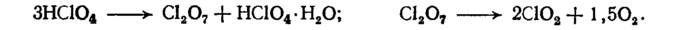 При этом продукт окрашивается—от темно-красного до коричневого цвета. Чистая хлорная кислота не обладает взрывчатыми свойствами, но при хранении в ней постепенно накапливаются продукты разложения, в частности СЮа, который обладает сильными взрывчатыми свойствами: