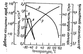 Рис. 3.17. Зависимость плотности р, давления насыщенных паров р, удельной проводимости у и диэлектрической проницаемости в пентафторида хлора от температуры