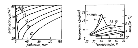 Характерной особенностью жидкого водорода является зависимость его физических свойств не только от температуры, но и от давления, а также от содержания пара- и ортомоди-фикаций. Например, зависимость плотности жидкого водорода от давления при различных температурах представлена на рис. 4.1, зависимость теплоемкости жидкого водорода от температуры при различных давлениях — на рис. 4.2. Наибольшие различия в теплоемкости отмечаются при давлении 3—4 МП а. Изменения теплоемкости водорода при постоянном давлении