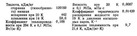 Жидкий водород представляет собой бесцветную прозрачную жидкость плотностью 73 кг/м3 при 20 К; с температурой кипения 20,6 К и температурой кристаллизации 14,1 К. Он легче воды в 14 раз, топлива типа керосина—в 11 раз и несим-диметилгидразина — в 9 раз. Ниже даны основные физические свойства водорода [47]: