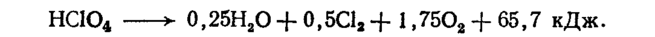 Химически чистая хлорная кислота представляет собой бесцветную, дымящую на воздухе жидкость. Большая плотность—1770 кг/м3, низкая температура замерзания—161 К и относительно высокая температура кипения—383 К повышают интерес к ее применению в ракетной технике. Однако при нагревании выше 363 К хлорная кислота начинает разлагаться с выделением тепла: