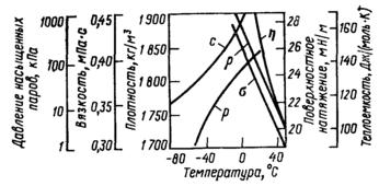 Рис. 3.16. Зависимость плотности р, давления насыщенных-паров р, динамической вязкости , поверхностного натяжения и теплоемкости с трифторида хлора от температуры