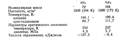 К перспективным окислителям этого класса соединений следует отнести Трифторид азота NF5 и тетрафторгидразин N2F4. Оба окислителя—криогенные вещества. Их физические свойства следующие [4]: