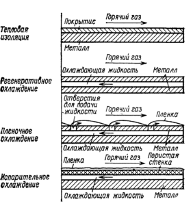 Существуют различные способы снижения температуры стенок камеры сгорания: тепловая изоляция, регенеративное, пленочное и испарительное охлаждение (рис. 1.11). Камеры сгорания современных ЖРД, как правило, имеют охлаждающую рубашку. Она отсутствует лишь у двигателей малой тяги космических аппаратов и у некоторых типов двигателей с внутренней тепловой изоляцией. Кроме того, в теплонапряженных двигателях для предохранения стенок камеры сгорания от прогара создают пристеночную завесу из горючего, подаваемого через периферийные форсунки головки камеры сгорания, при этом обеспечивается пленочное или испарительное охлаждение.