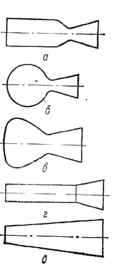 a — цилиндрическая с горловиной; б — сферическая; в — грушевидная; г—цилиндрическая без горловины; д—коническая