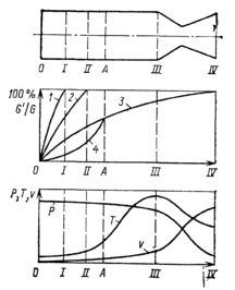 В первой зоне (0-1) происходит распыл топлива через форсунки при высоком давлении, а также частично его испарение и смешение капель топлива. Длина этой зоны определяется конструкцией головки (плоская, шатровая или сферическая) и типом форсунок (центробежные, струйные, сотовые и др.). Процессы, происходящие в первой зоне, в значительной степени определяют работу ЖРД в целом. От качества распыла компонентов топлива сильно зависит эффективность горения топлива и, следовательно, к. п. д. двигателя. На характер и качество распыла топлива, кроме конструкции форсунок и головки камеры, существенно влияют вязкость, плотность и поверхностное натяжение компонентов топлива.