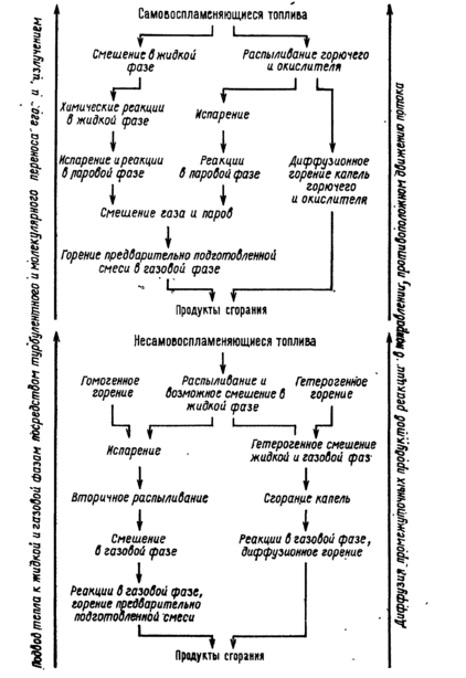 Рис. 1.10. Схема процесса горения в ЖРД самовоспламеняющихся и несамовоспламеняющихся топлив