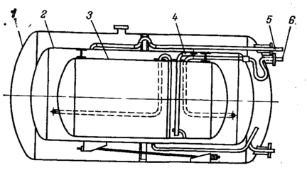 / — кожух, 2 — емкость для жидкого азота, 3 — емкость для жидкого фтора, 4 — тру­бопровод слива жидкого фтора; 5—вентиляционный трубопровод емкости 1, 6 — трубопровод налива жидкого фтора