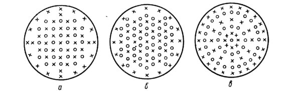 а — шахматное; б — сотовое, в — концентрическое; X — форсунки горючего; О — форсунки окислителя