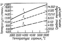 Рис. 1.14. Зависимость температуры стенки к среднего теплового потока от 'температуры горения топлива: