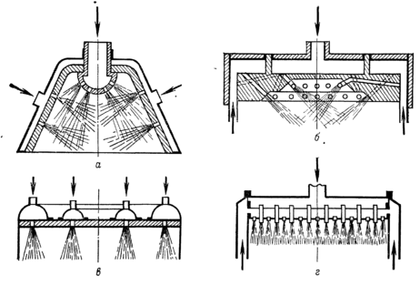 а — шатровая головка с центральным подводом окислителя; б — головка с тонкими сверлениями для подвода компонентов; в — головка с концентрическими поясами форсунок подачи окислителя и горючего; г—головка с двойным дном и сотовым или шахматным расположением форсунок