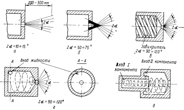 а — струйная; б — струйная с пересекающимися струями; в — центробежная с завихрителем; г — центробежная с тангенциальным входом; д—двухкомпонентная центробежная