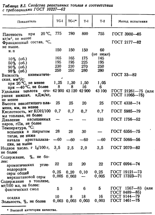 ственные испытания с положительными результатами на двигателях или по комплексу методов квалификационных испытаний в соответствии с установленным порядком. Нормы по показателям качества этих топлив приведены в табл. 8.3. Кроме того, в топливе должны отсутствовать: сероводород (ГОСТ 17323—71), водорастворимые кислоты (ГОСТ 6307—75, индикаторный метод), водорастворимые щелочные соединения, механические примеси и вода (методы определения изложены в ГОСТ 10227—62), мыла нафтеновых кислот (ГОСТ 21103—75). Топливо должно выдерживать испытание при 100 °С в течение 3 ч на медной пластинке без изменения цвета пластинки (ГОСТ 6321—69). Допускается вырабатывать топливо ТС-1 с температурой начала кристаллизации не выше —55 и —50 °С, предназначенное для всех климатических зон, за исключением зоны l1 (ГОСТ 16350—80). Топливо ТС-1 для применения в климатической зоне l1 получают по согласованию с потребителем. В отдельных случаях (по особому требованию потребителей) топливо Т-1 должно выпускаться плотностью при 20 °С не менее 810 кг/м3. Для улучшения эксплуатационных свойств в топлива ТС-1, Т-1 и Т-2 могут вводить присадки, допущенные к применению в установленном порядке (антистатические, противообледенительные и др.).