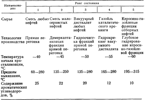 Термостабильные реактивные топлива. Наиболее массовое термостабильное топливо РТ могут получать прямой перегонкой, смешением продуктов прямой перегонки и гидроочистки и гидроочисткой прямогонной фракции 135—280 °С из различных нефтей. В результате гидроочистки резко снижается содержание общей серы, нестабильных углеводородов и смолистых соединений, практически полностью удаляются меркаптаны. Все это снижает склонность топлива к образованию отложений, однако повышает окисляемость и ухудшает противоизносные свойства. Для улучшения противоизносных свойств в топливо разрешается вводить противоизносную присадку (от 0,002 до 0,004%), а для снижения окисляемости—присадку ионол (от 0,003 до 0,004%).