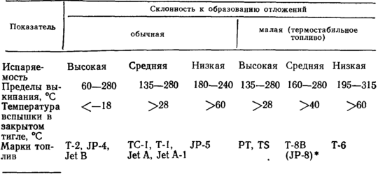 Реактивные топлива обычно классифицируют по двум доминирующим признакам: склонности к образованию отложений и испаряемости (табл. 8.1) [147]. Оба признака указывают возможную область применения топлив в зависимости от типа летательного аппарата.