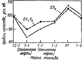 Т-1 из сахалинских нефтей, Т-1 из бакинских нефтей, Т-2, ТС-1, Т-8 и РТ. Сравнительно низкое значение уровня качества топлива Т-8 объясняется отсутствием в нем присадок и невысокими противоизносными свойствами, косвенно оцениваемыми по кислотности. Полученные результаты подтверждают прогрессивность тенденции развития нефтеперерабатывающей промышленности, предусматривающей расширение выпуска гидроочищенных топлив и сокращение производства топлива Т-1.