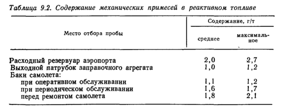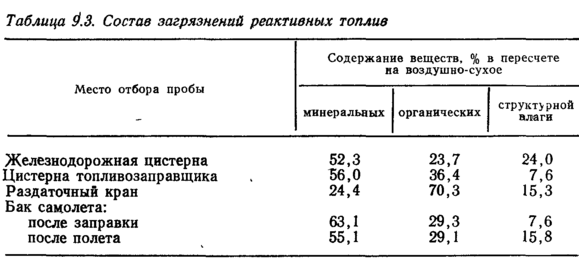 Содержание механических примесей в топливе, по данным КИИ ГА, приведено в табл. 9.2. В состав загрязнений реактивного топлива кроме минеральных и органических веществ входит вода. Соотношения между указанными веществами характеризуют данные табл. 9.3 [150].