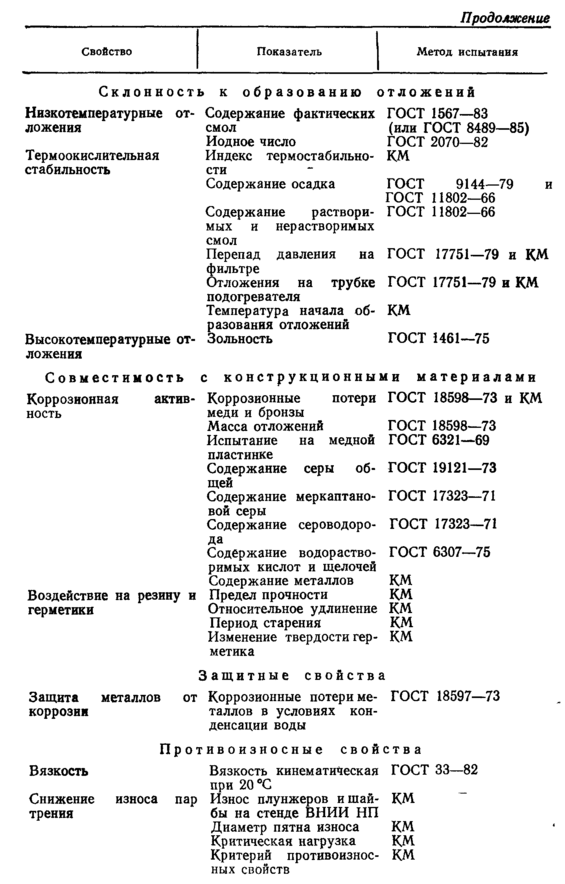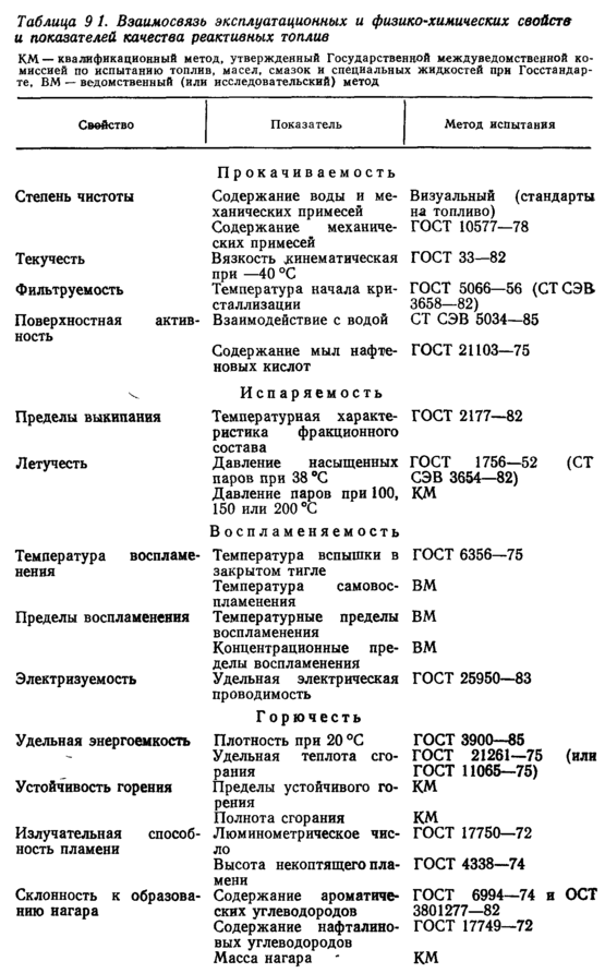 Химмотология выделяет и изучает следующие эксплуатационные свойства реактивных топлив: прокачиваемость, испаряемость, воспламеняемость, горючесть, склонность к образованию отложений, совместимость с конструкционными материалами, фрикционные, противоизносные, защитные и охлаждающие свойства, а также токсичность [152]. Каждое из этих свойств определенным образом связано с физико-химическими свойствами и показателями качества топлива. Взаимосвязь эксплуатационных свойств с показателями качества реактивных топлив показала в табл. 9.1.