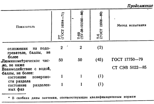 Нормы по показателям качества термостабильных топлив приведены в табл. 8.4. В топливах РТ, Т-8В и Т-6 должны отсутствовать сероводород (для Т-6 норма устанавливается на месте производства), водорастворимые кислоты и щелочные соединения, а также механические примеси и вода, мыла нафтеновых кислот (для РТ). Топлива должны выдерживать испытания на медную пластинку. В случае Топлива РТ допускается изменение цвета пластинки до оранжевого, темно-оранжевого или малинового, а также отдельные пятна тех же цветов, при этом до введения присадок пластинка после испытания не должна изменять начального цвета и блеска. Стандартом нормируется уровень противоизносных свойств топлива РТ: износ плунжеров натурного насоса-регулятора во время стендовых испытаний не должен превышать 0,2 мм. В случае, разногласий предусмотрены определение механических примесей массовым методом (ГОСТ 10577—78) и норма—не более 0,0003%.