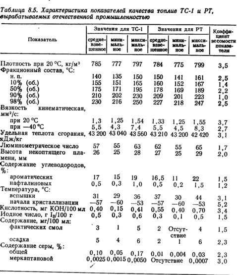Фактический уровень качества топлив. Отечественная промышленность вырабатывает реактивные топлива, как правило, имеющие запас качества, особенно по показателям, наиболее склонным к изменению при хранении топлив. В зависимости от состава сырья, специфики технологии производства, ассортимента и объема получаемых реактивных топлив, изготовленных на различных предприятиях, их качество неодинаково. Данные по фактическим показателям качества топлив ТС-1 и РТ—наиболее массовых топлив—приведены в табл. 8.5