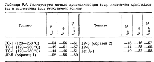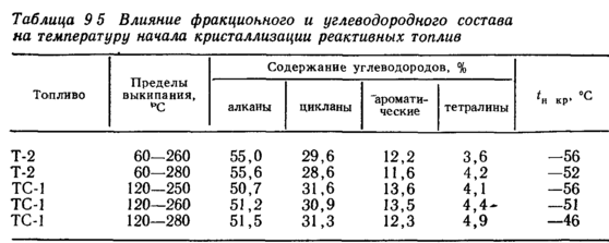 Большая разность между указанными температурами для различных образцов топлив, как, например, для JP-8, определяется наличием в топливе нормальных алканов разной молекулярной массы. Присутствие в топливе небольшого количества высокомолекулярных алканов резко повышает tн кр, но мало влияет на tзаст. Температура начала кристаллизации практически не зависит от общего содержания алканов в топливе и в основном определяется температурой конца кипения топлива, т. е. наличием высокомолекулярных алканов. Это подтверждают данные, представленные в табл. 9.5.