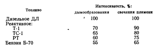 Как следует из этих данных, при горении топлива тепло-напряженность стенки жаровой трубы значительно зависит от конструкции двигателя и давления в камере сгорания. При постоянстве последних использование топлива с меньшим ЛЧ приводит к повышению плотности лучистой энергии факела и дополнительному нагреву стенок камеры сгорания. Это может быть причиной перегрева стенок, уменьшения усталостной прочности металла и появления в нем трещин, коробления и