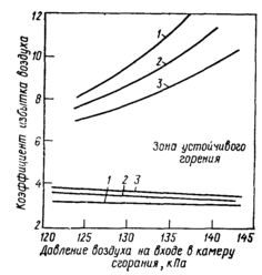 Пределы устойчивого горения зависят и от условий сгорания топлива—давления и температуры поступающего воздуха.