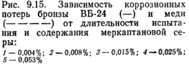 Меркаптаны особенно коррозионно-агрессивны по отношению к бронзе и меди, к свинцу, иридию и кадмию, из которых изготавливают детали топливной аппаратуры. На рис. 9.15 показано влияние меркаптанов на коррозию бронзы ВБ-24 и меди Ml при 60 °С [193]. С увеличением содержания меркаптанов в топливе повышается скорость коррозии, и по мере их расходования на коррозионный процесс, т. е. снижения содержания в топливе, коррозия замедляется и в итоге стабилизуется. Коррозионная агрессивность меркаптанов зависит от их строения. Она возрастает по мере уменьшения размеров молекулы и снижения температуры их кипения. Так, меркаптаны, содержащиеся во фракции 130— 240 °С, не вызывают значительной коррозии меди за 100 ч при 60 °С, а содержащиеся во фракции 60—130°С почти полностью взаимодействуют с металлом в этих условиях. Наиболее коррозионно-агрессивны меркап-таны алифатического строения,