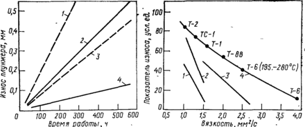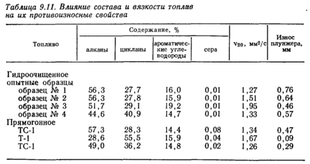 Вязкость. Влияние вязкости на Противоизносные свойства топлив характеризуют зависимости, представленные на рис. 9.20. Особенно наглядно роль вязкости проявляется в случае гидроочищенных топлив, о чем свидетельствуют данные стендовых испытаний на серийном насосе-регуляторе в течение 100 ч при однократном прокачивании нагретого топлива (табл. 9.11) [206].