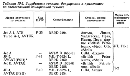 от режима работы топливорегулирующих агрегатов отечественной техники. Топлива капиталистических стран, допущенные к применению на отечественной авиационной технике с ограничением ресурса топливно-регулирующей аппаратуры, приведены в табл. 10.6 [214].