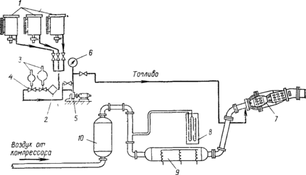 1- топливные баки, 2—фильтр; 3 — штихпроберы, 4— краны, 5—топливный насос, 6— манометр, 7—малоразмерная камера сгорания, S— приборы, измеряющие расход и давление воздуха, 9—электроподогреватель воздуха, 10—ресивер